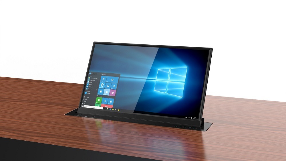 Модель оснащена моторизованным механизмом выдвижения с регулируемым углом наклона до 30 градусов. Сенсорный экран поддерживает мультитач-жесты для интуитивного управления. Антибликовое покрытие матрицы гарантирует читаемость информации при интенсивном освещении. Проходное питание и интерфейсы упрощают подключение периферийного оборудования без дополнительных коммутационных узлов.